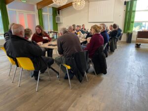 Na een kop koffie en korte instructie, is iedereen in groepen aan de slag gegaan. Onder andere zijn pompen binnengehaald, nummerborden geplaatst, is er volop gemaaid en palen geplaatst.